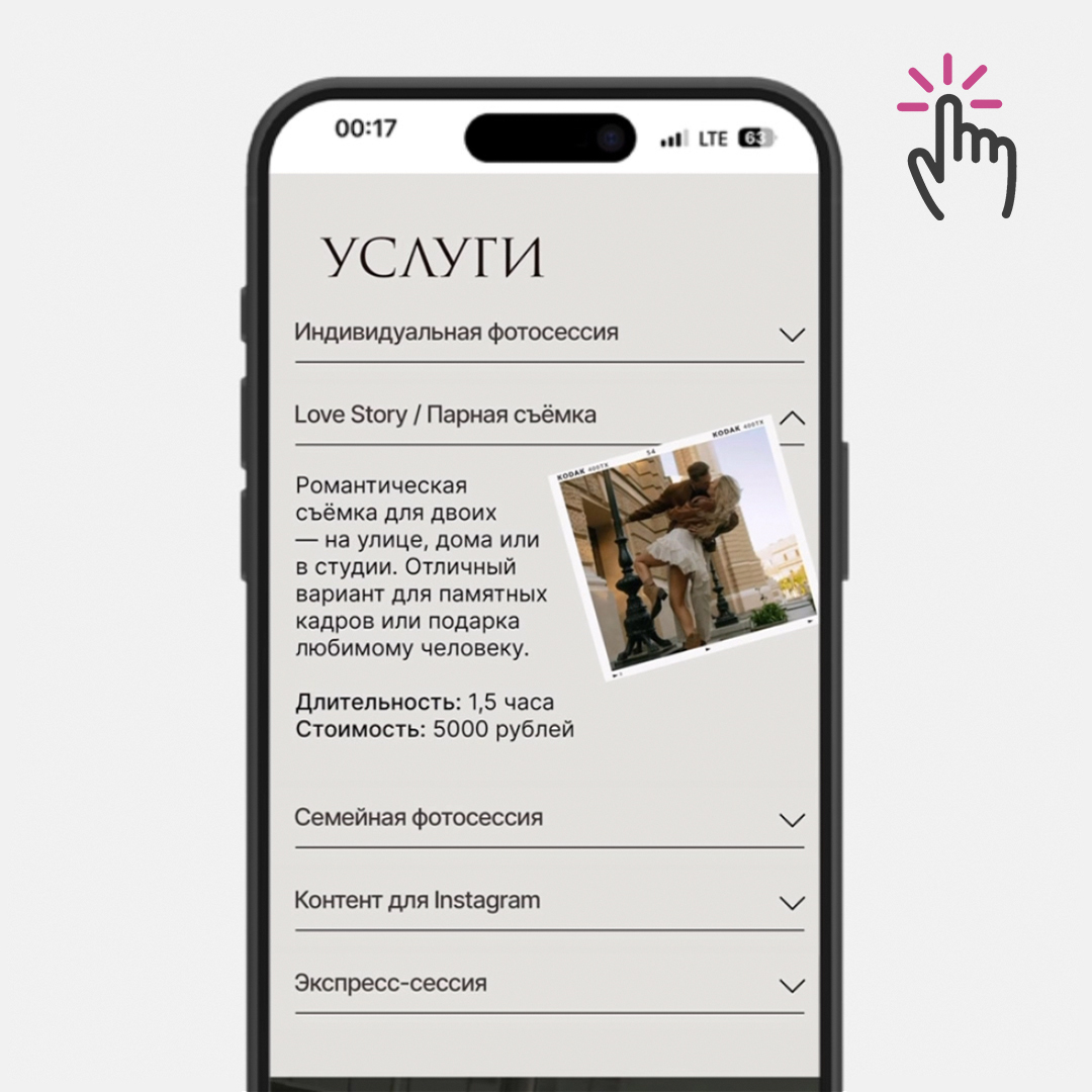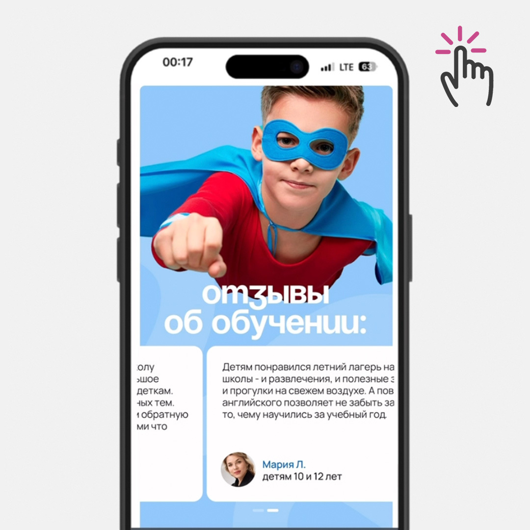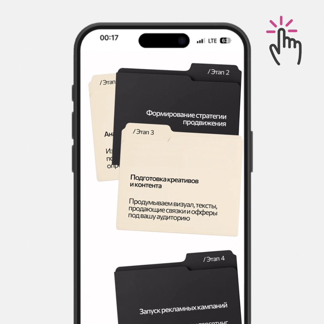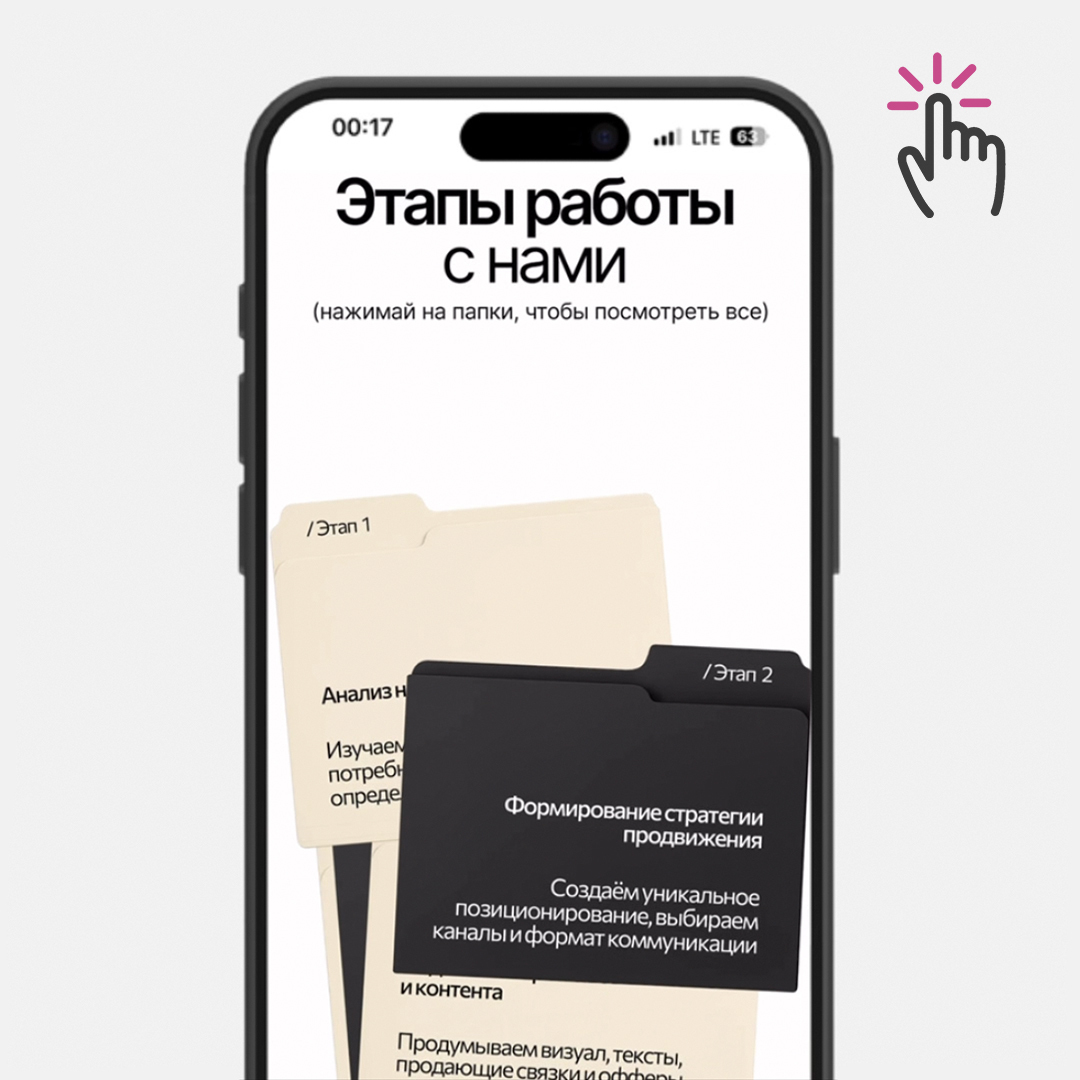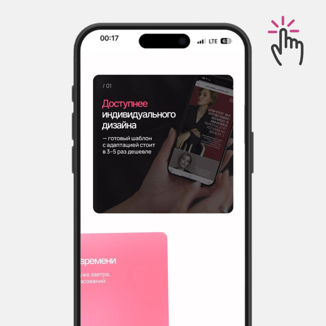 Вертикальный “сторис”-таймлайн — это аккуратный блок, который показывает путь клиента или процесс работы шаг за шагом: с аватарками, подписями и плавным появлением при скролле. Каждый шаг анимируется, текущий этап мягко пульсирует, а шрифт и размеры текста отдельно настраиваются для компьютера и мобильной версии.