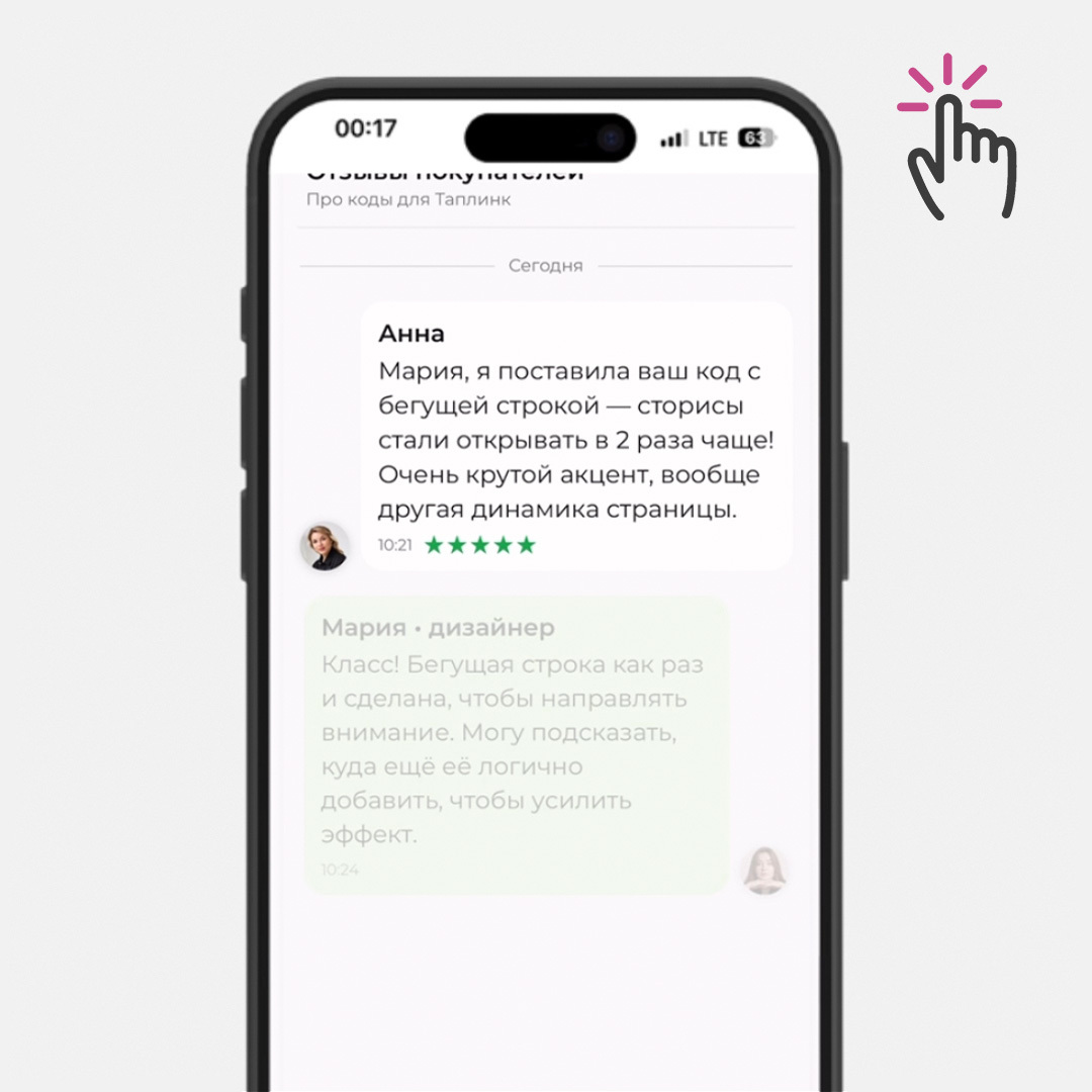 Блок с аккуратной подложкой и репликами, оформленными как переписка в мессенджере. Есть аватарки, пузырьки сообщений слева и справа, звёздочки рейтинга, скрин с результатами/примерами, разделение по дням и анимация появления реплик при прокрутке. Отдельные сообщения могут имитировать состояние «Печатает», создавая ощущение живой переписки. Можно добавлять любую длину сообщений - код автоматически подстроится.